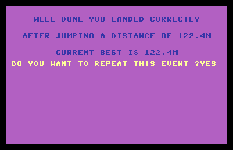 As you asked months before, I'm packing a 64K crack of it, a useless but funny operation all in all, but, apart of the Event 6 bug, the flickery rasters, the NTSC compatibility, a better menu interface and the records saving, I won't even touch any of the many flaws and lacks: it's a crack, not a remake. Also, I challenge new problems at any new day making it, the last one is the possibility of an additional digit to manage in the Event 2, which may reach the hundred meters.